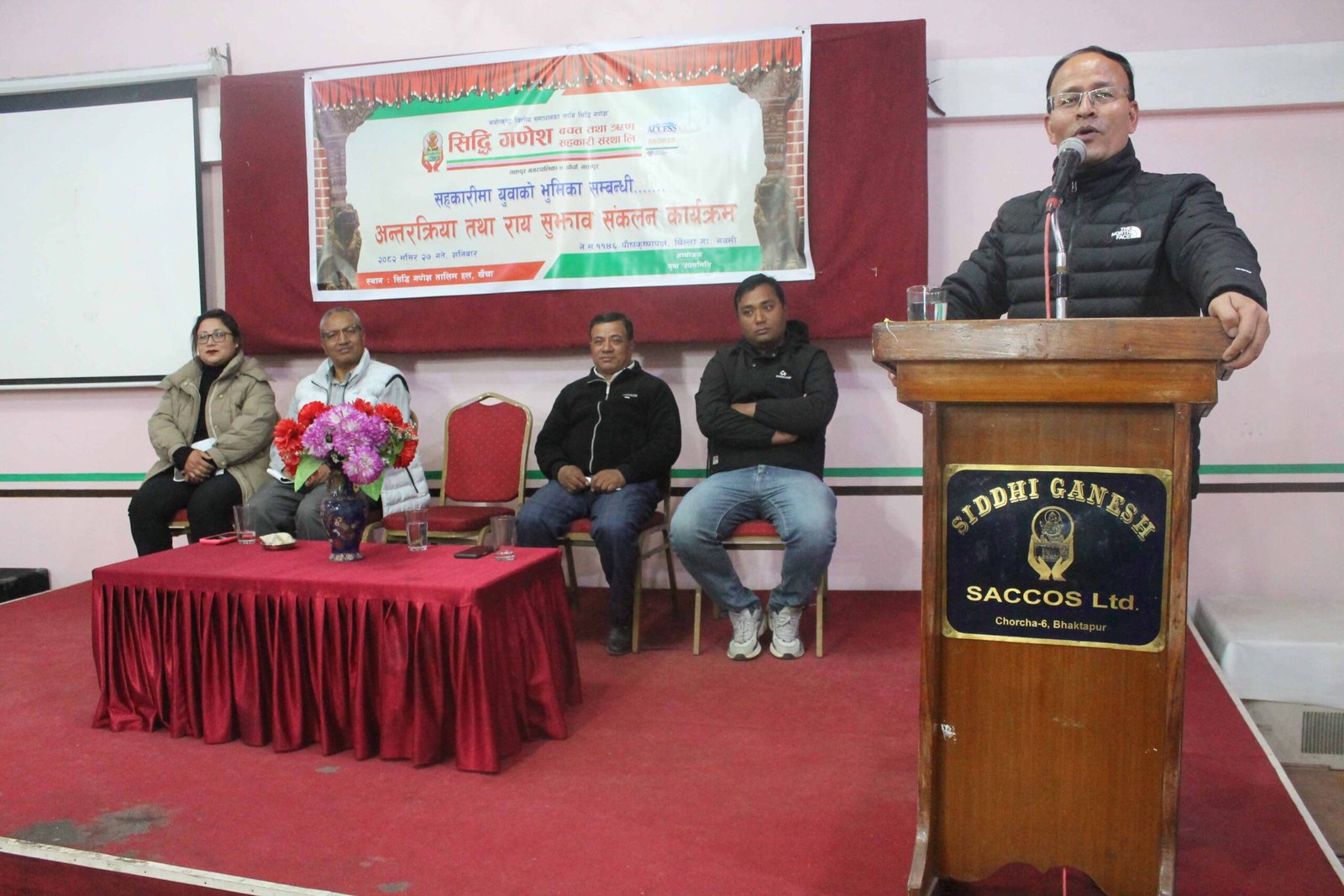 भक्तपुर, २७ मंसिर । सिद्धि गणेश बचत तथा ऋण सहकारी संस्था लि. को युवा उपसमितिको आयोजना तथा नेमकिपाका केन्द्रीय सदस्य एवं बागमती प्रदेश सभाका सदस्य सुरेन्द्र राज गोसाईको प्रमुख आतिथ्यमा सहकारीमा युवाको भुमिका सम्बन्धी अन्तरक्रिया तथा राय सुझाव संकलन कार्यक्रम सिद्धि गणेश तालिम हल, खचाँमा सम्पन्न भयो ।